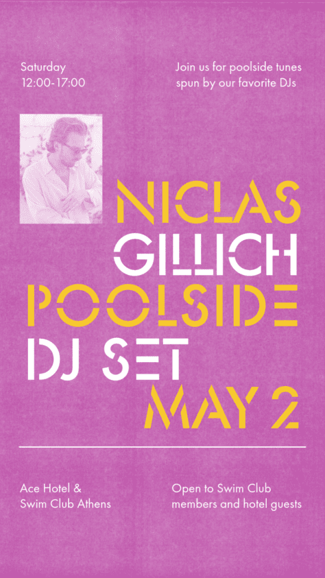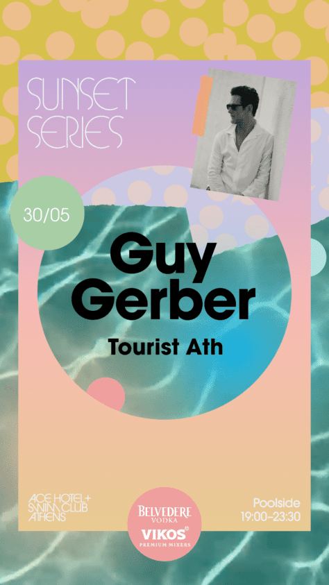 SUNSET SERIES is bringing world-class selectors to the Athenian Riviera. From golden hour into the night, join us at Ace Hotel & Swim Club Athens, April through September, for poolside revelry. This May, we welcome Guy Gerber to the decks. Tourist Ath on warm-up duty. For event table reservations, email fb.ath@acehotel.com or call +30 6956 335 215. Table