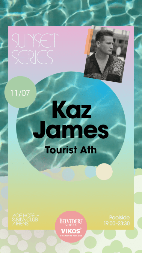 SUNSET SERIES is bringing world-class selectors to the Athenian Riviera. From golden hour into the night, join us at Ace Hotel & Swim Club Athens, April through September, for poolside revelry. This July, we welcome Kaz James to the decks. Tourist Ath on warm-up duty. For event table reservations, email fb.ath@acehotel.com or call +30 6956 335 215. Table